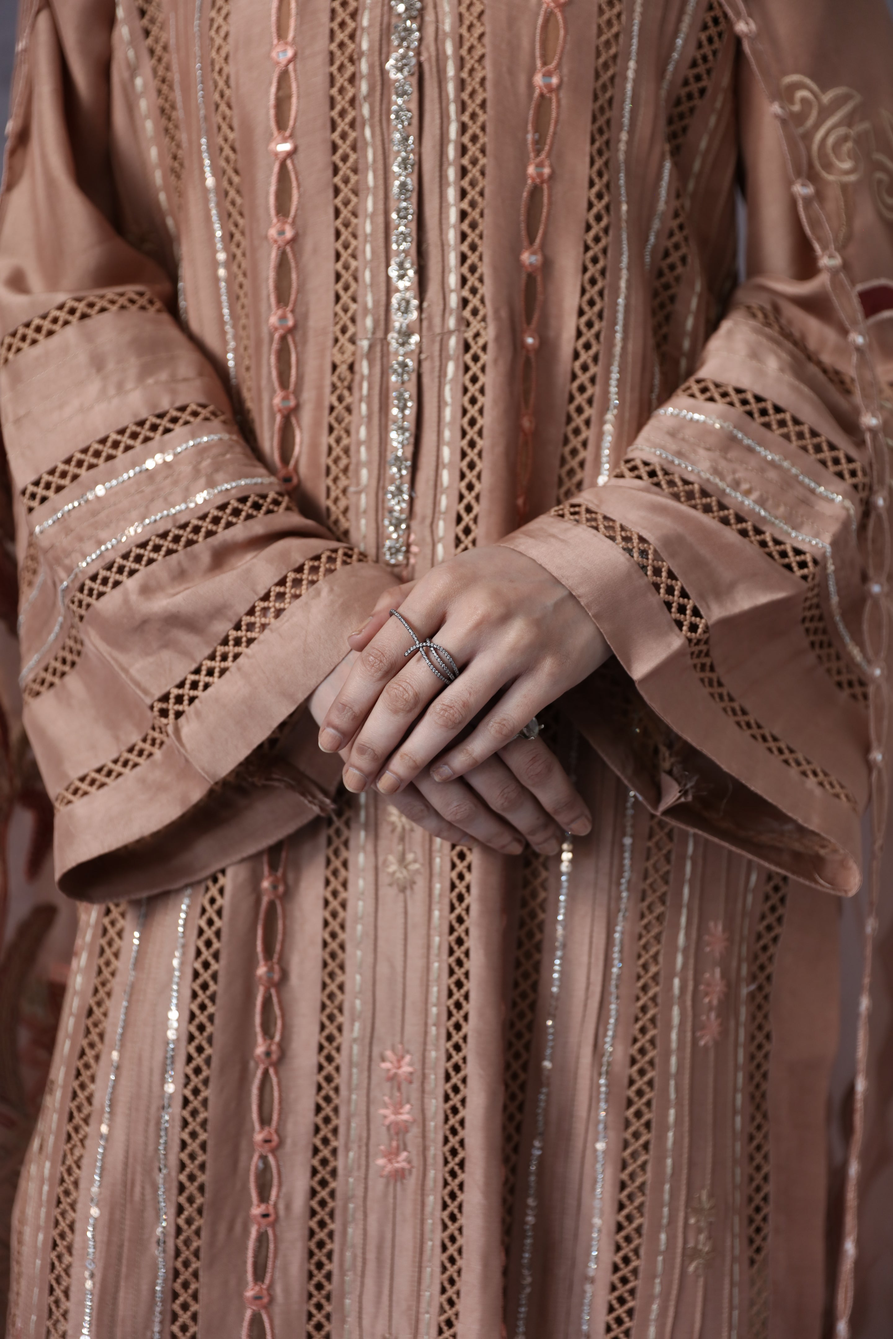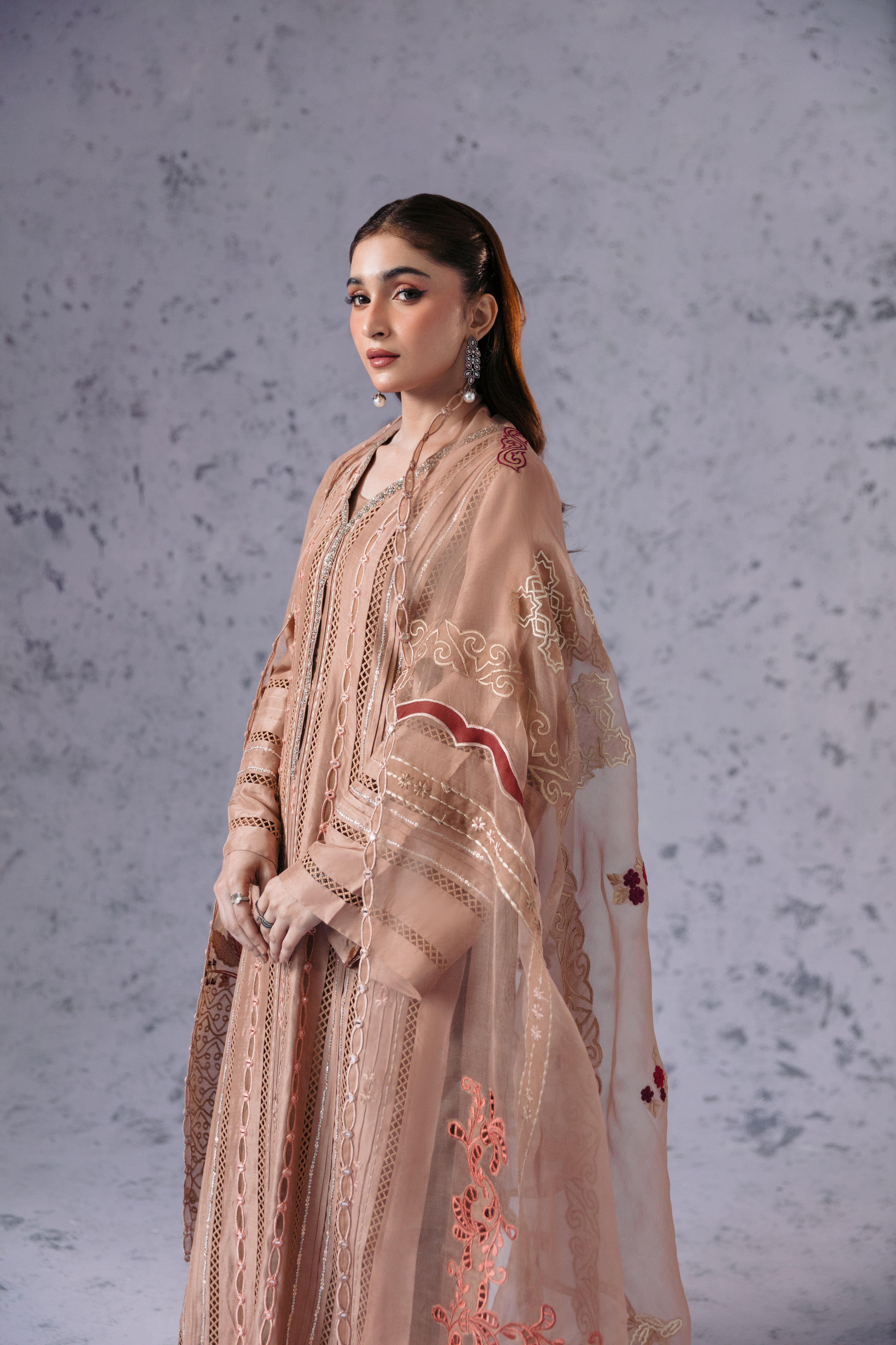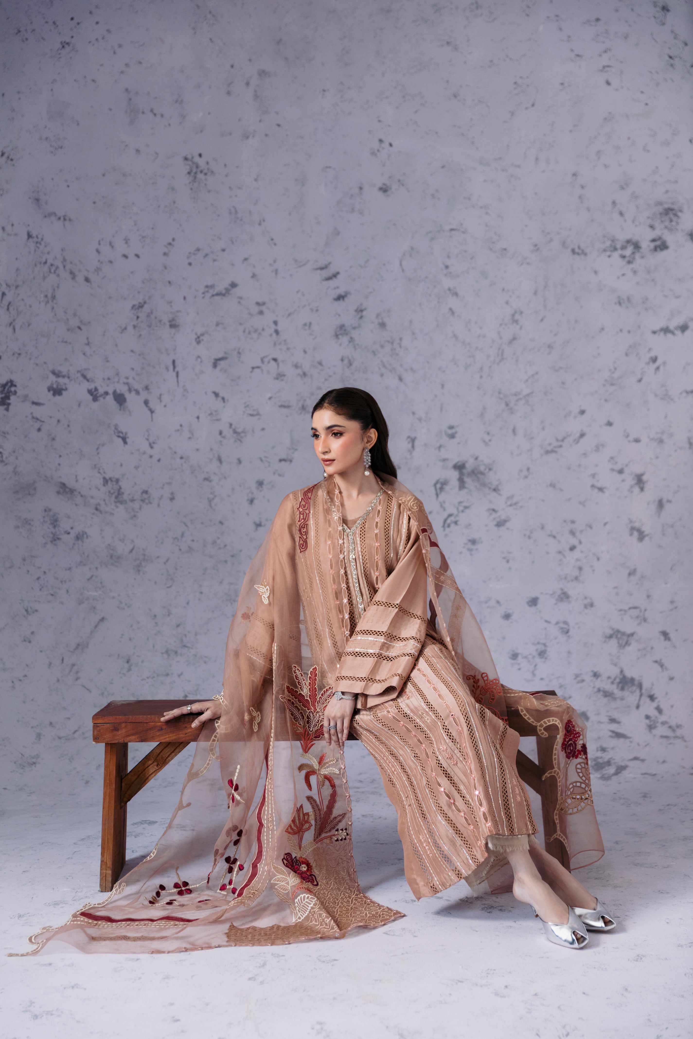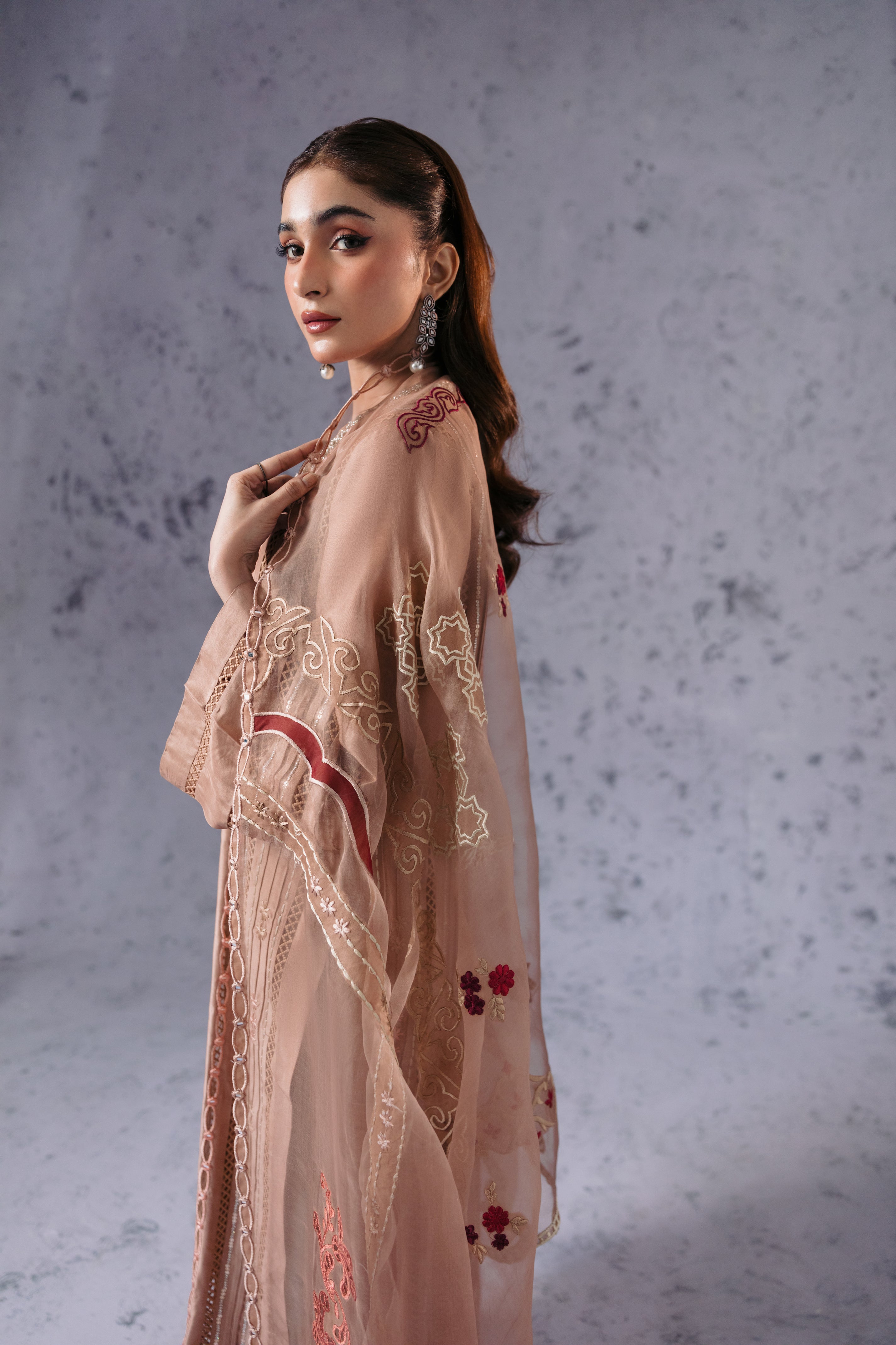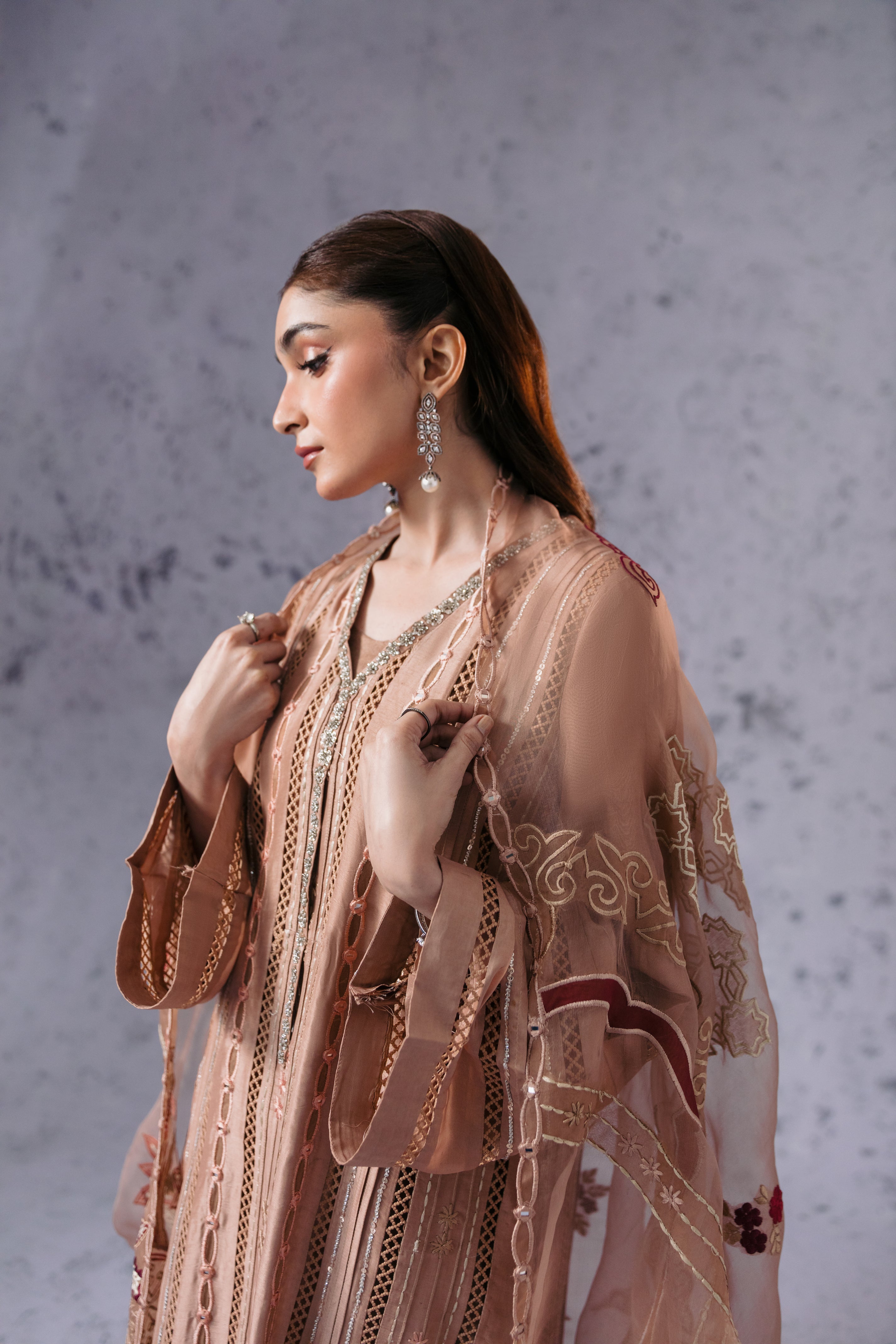 Seraphine unfolds in a warm blush-beige palette, where softness meets intricate craftsmanship. Delicate embroidery and handwork traces the silhouette in fine linear detailing, creating texture and depth against the fluid base.