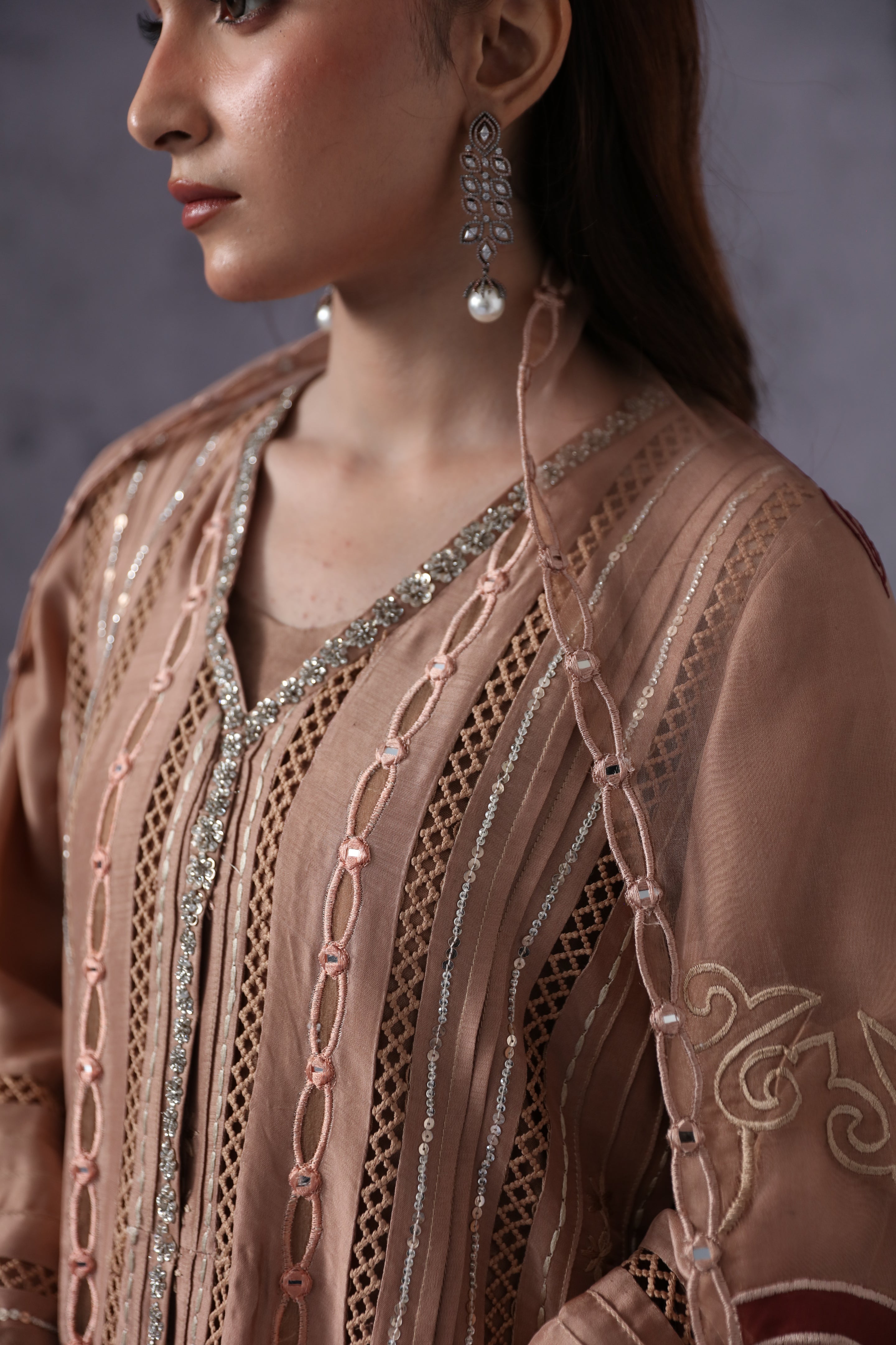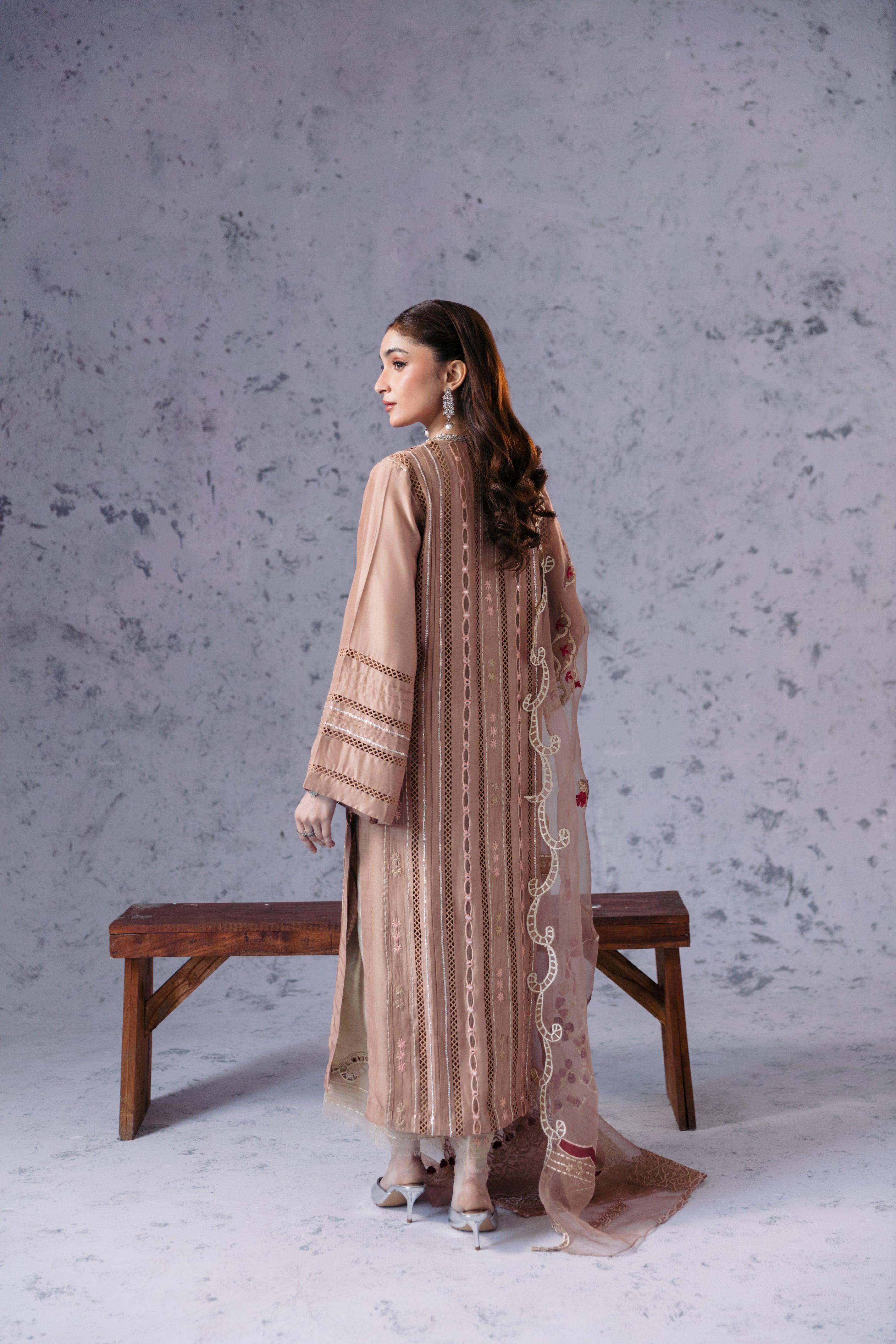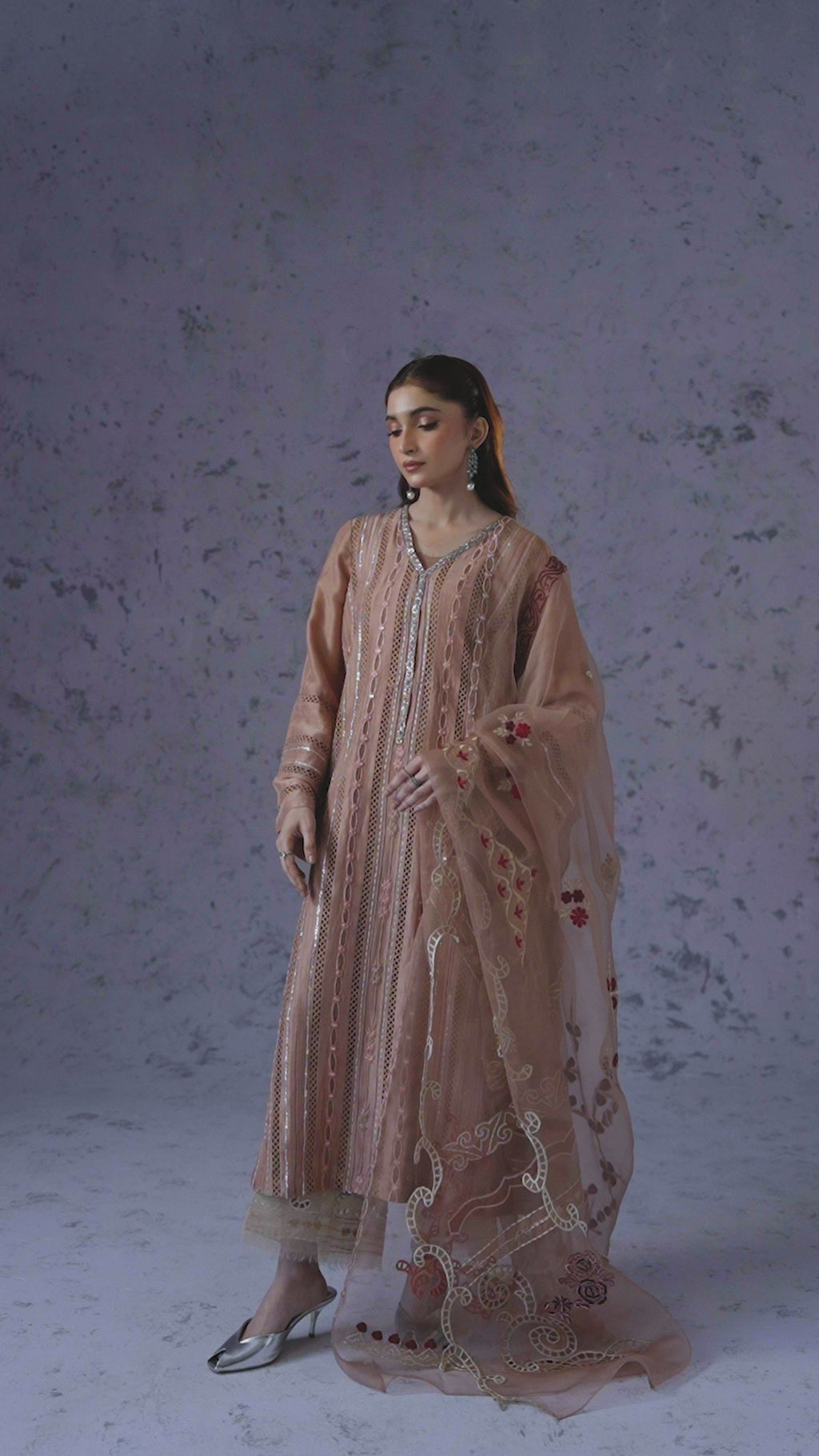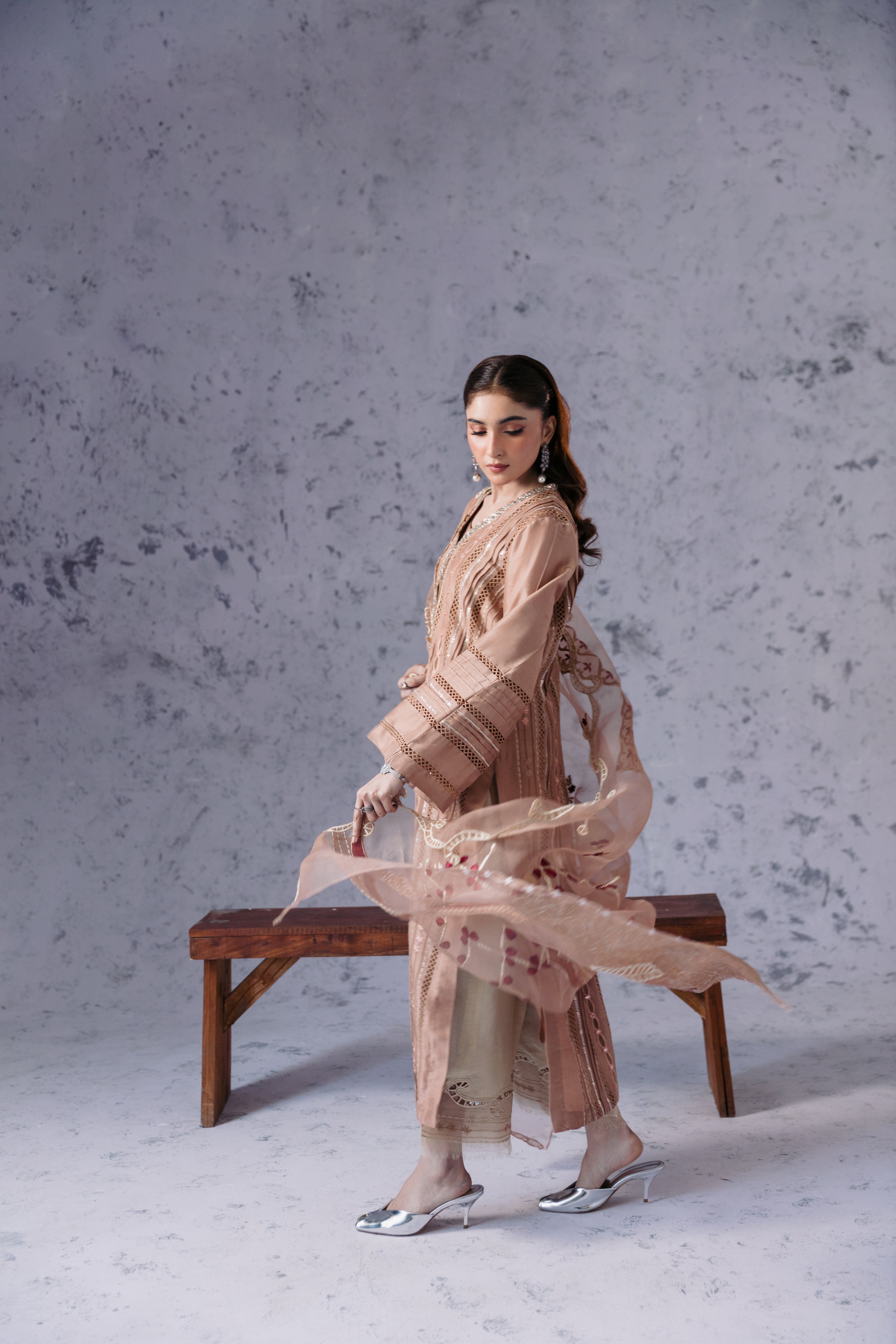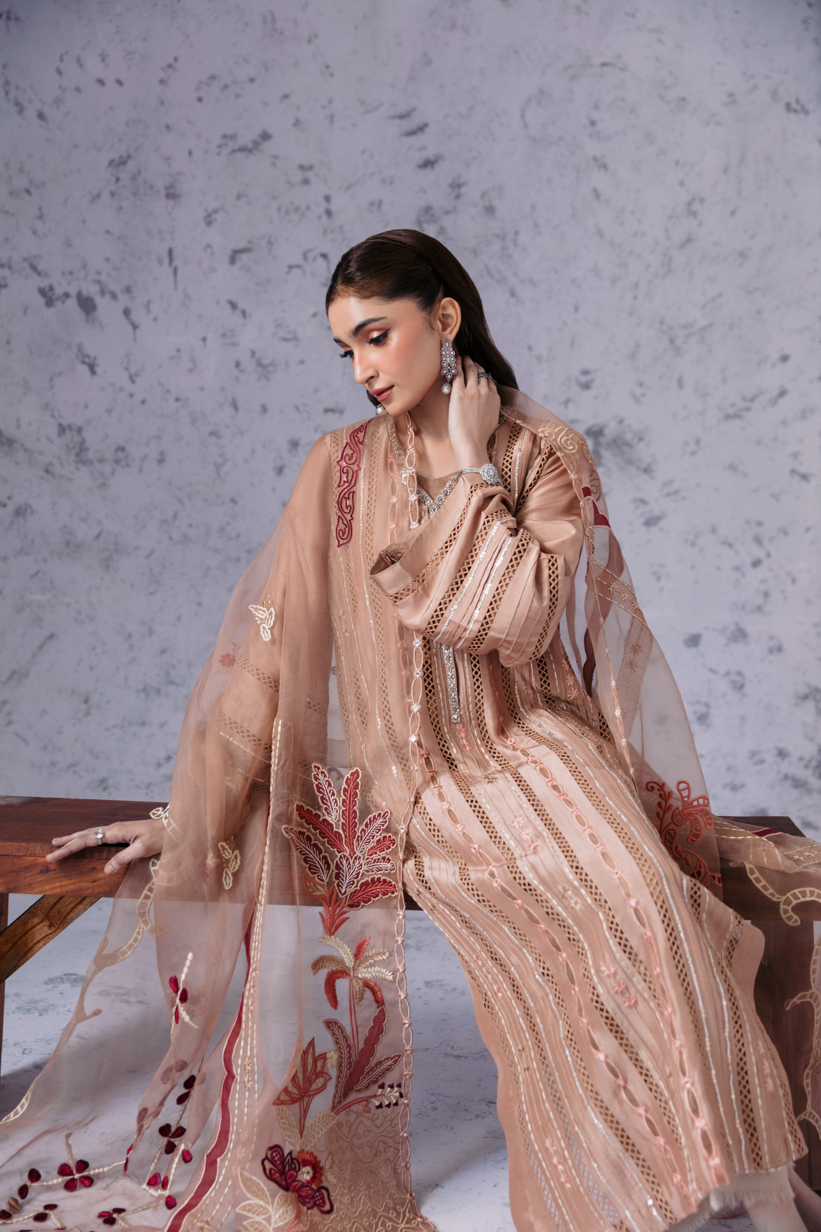 Seraphine unfolds in a warm blush-beige palette, where softness meets intricate craftsmanship. Delicate embroidery and handwork traces the silhouette in fine linear detailing, creating texture and depth against the fluid base.